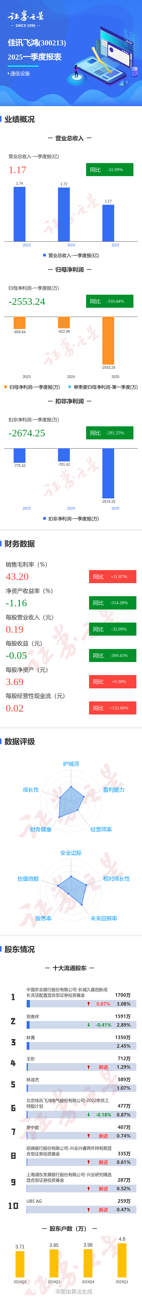 证券之星消息,佳讯飞鸿2025年一季报显示,公司主营收入1.17亿元,同比下降32.09%;归母净利润-2553.24万元,同比下降310.45%;扣非净利润-2674.26万元,同比下降281.26%;负债率27.51%,投资收益-68.61万元,财务费用221.44万元,毛利率43.2%。